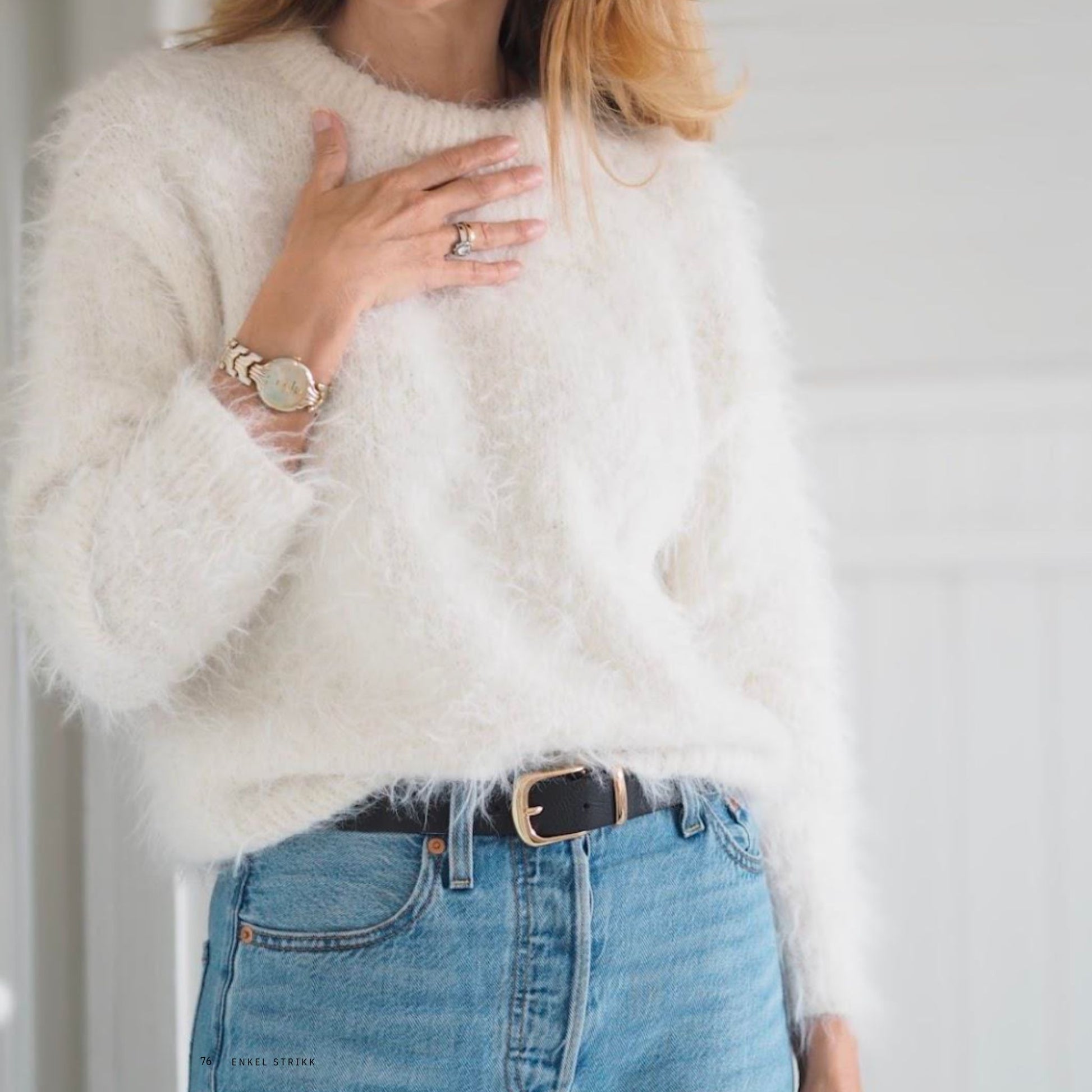 Arbeidet strikkes rundt på rundpinne nedenfra og opp til ermehullene. Arbeidet deles til for -og bakstykke og hver del strikkes ferdig hver for seg med skrå skuldre. Skuldrene sys sammen og det plukkes opp masker til halskant som strikkes rundt på liten rundpinne. Plukk opp masker til ermene og strikk ermene rundt på rundpinne ovenfra og ned.